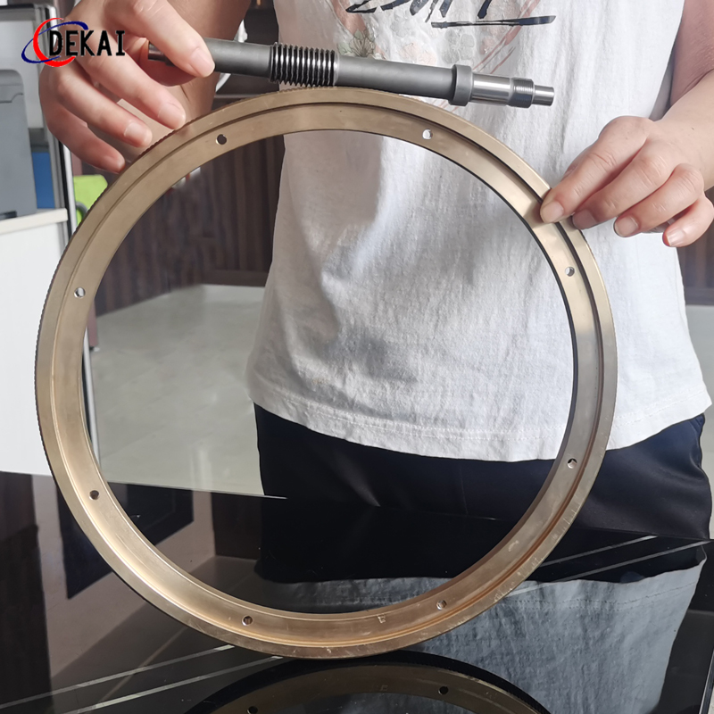 精密雙導(dǎo)程蝸桿副的優(yōu)點(diǎn):分度精度高,側(cè)隙可調(diào)整至0.01~0.03Mmm;齒面接觸穩(wěn),不會(huì)改變中心距。調(diào)整標(biāo)準(zhǔn),方便可靠。裝配靈活,裝配時(shí),用調(diào)整環(huán)來(lái)獲得合適的嚙合側(cè)隙。使用中如果因?yàn)槟p導(dǎo)致傳動(dòng)間隙增大,只要調(diào)整一下蝸桿的軸向位置,可以使蝸桿蝸輪傳動(dòng)副恢復(fù)到原來(lái)的精度,不需要更換新的蝸桿,蝸輪,比較實(shí)用。蝸桿材質(zhì)采用40Cr,42CrMo、38CrMoAl合金鋼。蝸桿采用錫青銅ZCuSn10Pb1離心澆鑄,具有高強(qiáng)度耐磨性。